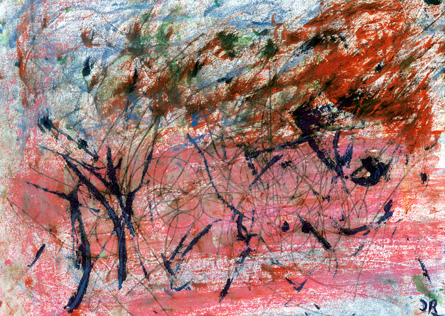 Vor der Ankunft der amerikanischen Truppen im Norden und der sowjetischen Truppen im Osten ein Lager, Block für Block abgebrannt von der SS, die keinerlei Anzeichen von Leben zurücklassen wollte, keinerlei Anzeichen vom Tod am Fließband – wo doch der Boden, feuerrot, vom Blut getränkt ist.
